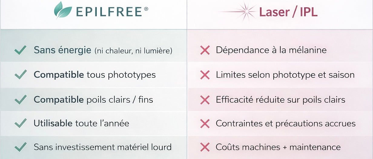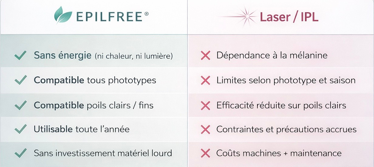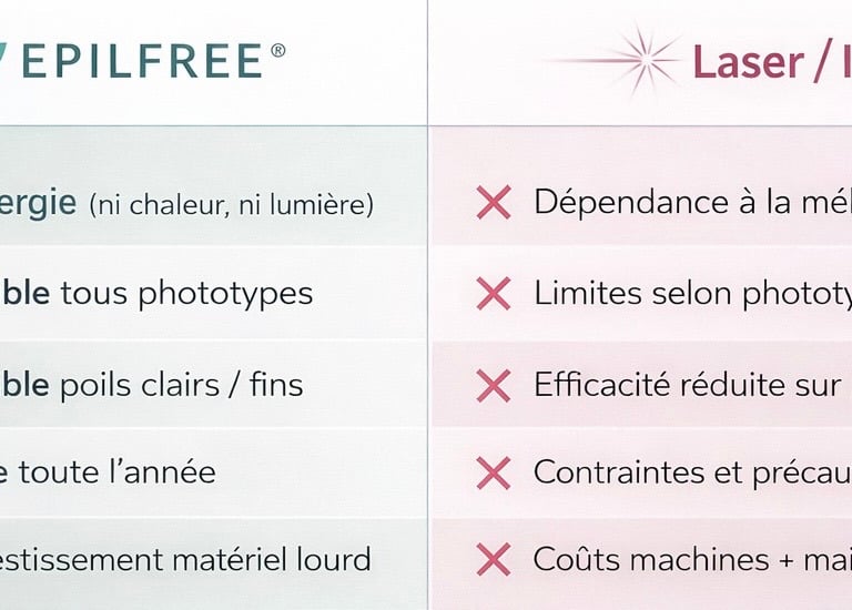 EPILFREE® s’inscrit comme une alternative professionnelle crédible aux technologies laser et IPL,