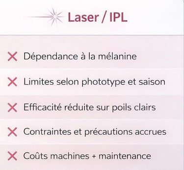 mais vous constatez certaines limites en cabine : poils clairs ou fins, zones hormonales, clientes non éligibles ou résultats insuffisants.